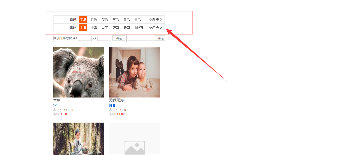 注意:在产品列表插件页面显示的多条件筛选产品类型是在后台-》产品属性中设置的全局筛选类型。
